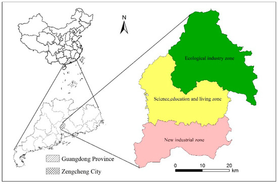 With the objective of ecological conservation and under the guidance of the Scientific Outlook on Development, a guiding socio-economic principle of the CPC, a “three economic zones” strategy was employed in Zengcheng to spatially allocate various industries (Figure 1). The northern ecological industrial zone is a strictly conserved area mainly used for tourism and urban agriculture. The science, education, and living zone is planned to form a high-end living area by importing residential and educational components. The new southern industrial zone is served for developing strategic emerging industries to form an industrial agglomeration combining with the original manufacturing industrial base there.