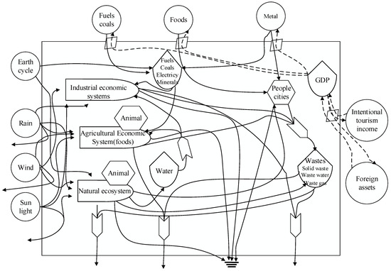 Emergy analysis and the input–output method were incorporated to evaluate regional eco-efficiency. Odum (1983) introduced emergy analysis in the 1980s [36]. There is fundamental difference among various types of energy as long as quality and value are concerned; therefore, energy cannot be added or subtracted directly in a system [37]. The values of various forms of energy were standardized into that of solar energy as the standard energy value, based on their emergy transformity [38]. After conversion, the emergy of the inputs and outputs can be compared and analyzed within the same system [39]. An I-O table records the direction of material and capital flow in the region, providing a detailed database for an emergy analysis [40]. The main procedures of emergy analysis are: (1) determine the boundary of the study area and project the inner relationship within the emergy systems [41] (Figure 2); (2) calculate the emergy of the various energy flows; (3) establish an evaluation index system on a circular economy, and calculate the respective values; and (4) analyze the dynamics and driving mechanism of the emergy.