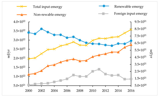 The emergy of foreign inputs and outputs both show an increasing trend, and the gap between the two sides has widened. The emergy of foreign inputs reached 1.44 × 1021 seJ in 2016, which was 2.44 times the 2000 figure. The emergy of foreign outputs increased from 1.99 × 1021 seJ to 1.98 × 1022 seJ during the same time with about a tenfold increase since 2000.