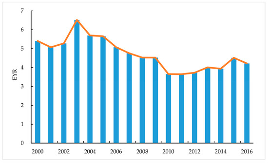 Changes of emergy yield ratio (EYR), 2000–2016.