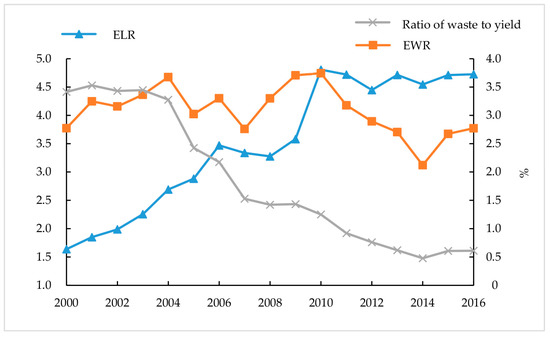The changes of environmental loading ratio (ELR), Ratio of waste to yield, and ratio of waste to total import (EWR), 2000–2016.