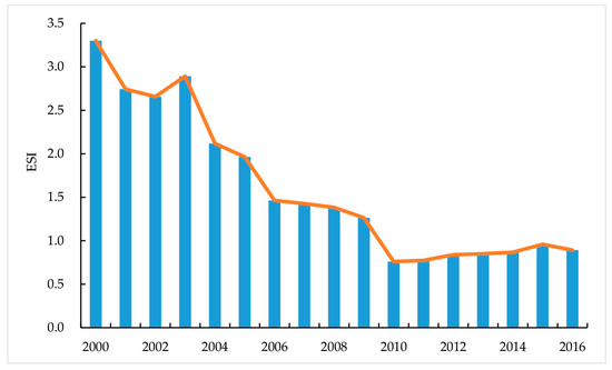 Changes of emergy sustainability index (ESI), 2000–2016.
