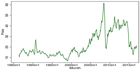 The real price of crude oil—the dependent variable—is the focus of our paper. We consider the West Texas Intermediate crude oil prices (WTI) as a proxy for crude oil. Recently, Alquist and Kilian (2010) [15], Alquist et al. (2013) [18], Baumeister et al. (2013, 2014, 2015) [13,17,19], Wang et al. (2015) [12], Xiong et al. (2013) [20], Yin and Yang (2016) [21], Drachal (2016) [10] and Naser (2016) [11] all regarded WTI as a proxy variable for oil prices. We selected four factors: supply, demand, crack spread, and non-energy commodity prices. According to economic theory, supply and demand are the key factors for changing the price of a commodity. Therefore, many researchers employ it as an independent variable to forecast oil prices (Baumeister and Kilian (2012) [22], Fattouh et al. (2013) [23], Hamilton (2009) [4], Wang et al. (2015) [12], Baumeister et al. (2013, 2014, 2015) [13,17,19]), and we follow in their steps. For supply, two factors—oil production and oil inventory—were selected. Oil production and oil inventory reflect the increment and stock of oil prices, respectively, and oil production is a key influencing factor for oil prices because it is directly related to the supply of oil. The oil inventory signals the speculation, and its fluctuation easily bursts the volatility of oil prices. Kilian’s index is a proxy of demand introduced by Kilian (2009) [24], and is based on the percentage change of growth rates obtained from a panel of single-voyage bulk dry cargo ocean shipping freight rates measured in dollars per metric ton. This index can reflect the global demand of industrial commodities. Since industrial commodities rely primarily on oil, Kilian’s index should be a reasonable and suitable proxy for oil demand. The cost of oil refining technology has a direct impact on oil prices. In general, refined products follow an approximately fixed proportion of 3:2:1, which means obtaining two barrels of gasoline and one barrel of heating oil from three barrels of crude oil. We denote the price changes of the refining process as the crack spread. In commodity markets, energy and non-energy commodity prices are always somewhat interdependent because both of them are necessities in life. We treat non-energy commodity prices as another variable to forecast. The data of the WTI, oil production, oil inventory, and crack spread are all from the U.S. Energy Information Administration (EIA), and the non-energy commodity prices are collected from the World Bank. Kilian’s index comes from his personal webpage (http://www-personal.umich.edu/~lkilian/). In this paper, all the variables on prices are divided by the Consumer Price Index (CPI), and we follow Drachal (2016) [10] and consider the U.S. Consumer Price Index (https://fred.stlouisfed.org/series/CPIAUCSL) a proxy variable for global CPI. In addition, for all variables, we chose the monthly data from June 1986 to December 2016, for a total of 367 observations.