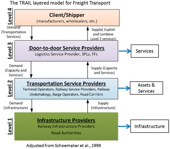 The stakeholders engaged in the first level provide the necessary infrastructure for the modes to operate. This can include stakeholders such as road, rail, and waterway infrastructure providers and port authorities. The next level includes the provision and management of assets and services to offer the necessary transportation by single modes of transport. The stakeholders that combine the services of the Level 2 stakeholders to offer door-to-door delivery of shipments from an origin to a destination are on Level 3. Note that in the case of unimodal and multimodal transport (parallel modes), Levels 2 and 3 may overlap. The last layer, Level 4, consists of shippers and receivers who are the freight owners and demand a certain level of offered services. The decision-makers in this fourth level set the destination, cost, and quality constraints of the transport services. The actors of each level set the demand that should be supplied by the stakeholders of the level below.