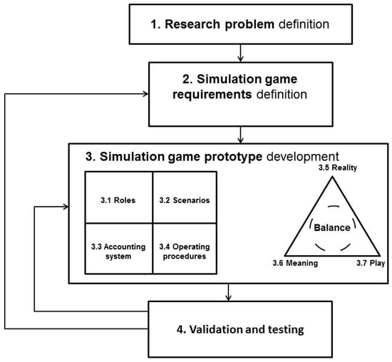 The game design process started with a so-called game storm, a brainstorm technique particularly designed for the design of Microgames, and for the definition of the related research problem and the requirements for the game, as illustrated in Figure 2. Microgames are short simulation games that support situated learning for a specific problem statement and can be used for research (as illustrated in [25,27]). The game brainstorm session was held with ten stakeholders (road, rail, and waterway infrastructure managers; port authorities) from the Dutch transportation domain, and four researchers with expertise in synchromodal transportation.
