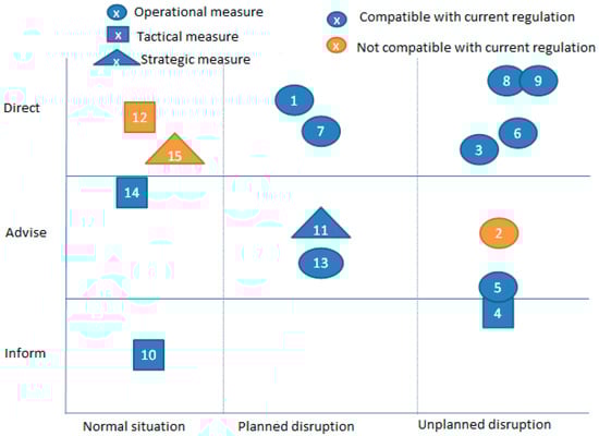 The fifteen cases have been categorised based on the type of measures (operational, tactical, or strategic) they require to be solved. They are represented in graphical format in Figure 3 in terms of the different information measures (inform, advise, direct) that could be helpful in dealing with these disruptions. These cases are introduced as either planned or unplanned disruptions in the network.