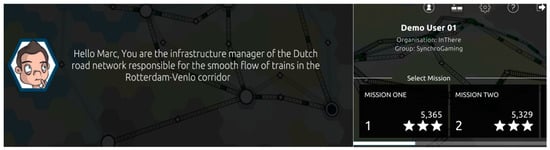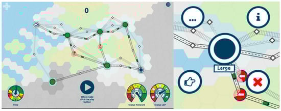 The result of the design process is a digital, single-player game consisting of different missions, representing a network of road, rail, and barge transport routes together with the various intermodal terminals in a hypothetical transport corridor in the Netherlands, as shown in Figure 4. The player assumes the role of an infrastructure manager, and has to deal with four Logistic Service Providers (LSPs)—LSPa, LSPb, LSPc, and LSPd—who are simulated agents within the game. Each of the LSPs is modelled in a way that they make route choices based on their respective priorities: for LSPa, reliability is more important; for LSPb, sustainability; and for LSPc, cost-effectiveness. LSPd introduces an element of randomness without a clear priority. Their preferred route choices are colour-coded for the player’s reference. In the next subsection, we will give some more information on the game scoring mechanism.