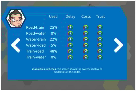 A literature review on the factors that influence freight-transport-related choices showed that LSPs value cost above reliability, i.e., shipments arriving on time ([35,36,37,38]). Hence, to calculate the LSP satisfaction score (Equation (2)) we used the weights 1 and 0.5, respectively, to describe the influence of cost and reliability on LSP satisfaction. Trust—an important KPI (Key Performance Indicator)—is not only a tool to measure modal manager performance, it is also a decision-making tool for the LSP. Higher trust means that the LSP will sooner choose to follow the advice of the modal manager. Since this is such an important game mechanism, we decided to increase the factor of trust to 2.5 when calculating the LSP satisfaction score. The LSP satisfaction score is thus calculated by Equation (2).
