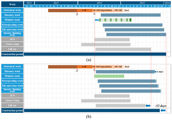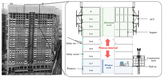 In tall residential building construction, there is a process gap between the window work and the structural work [1,2]. For tall building structural work, large formwork with several working platforms is generally installed outside the building [3]. These platforms limit the operation height of the construction hoists that lift window components. In addition, because a residential building has many walls and small windows compared with office buildings, there is a relatively large difference in productivity between the structural work and window work, which increases the process gap between these types of work. Because of these spatial constraints and productivity differences, window construction begins after several floors of structural work.
