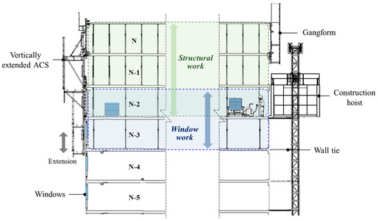 In the AWW method, window work is carried out on the lower work plates of the ACS while structural work is performed on the upper work plates, and window work is conducted in the same work cycle as structural work (Figure 2). This method removes the vertical constructability constraint between the two processes. It allows for an earlier start of finishing work and reduces the total period of construction by an amount equal to the decrease of the process gap between structure work and window work. In this method, an additional level of work plate is added to the ACS, and window work is performed on this level. As in the traditional method, the structural work is performed from the N-th to the (N − 2)-th floor, and the support is dismantled on the (N − 3)-th floor. Windows are lifted to the (N − 2)-th floor by construction hoists to complete window work on the (N − 2)-th and (N − 3)-th floors. To apply the AWW method, the following core technologies and management efforts are required: (1) a vertically extended ACS, (2) construction hoist operation, and (3) window work cycle management.