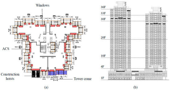 The AWW method was applied to two mixed-use residential buildings: a 36-story building (Building A) and a 33-story building (Building B) located in Gongneung-dong, Seoul, South Korea. The construction period was about three years and one month. Figure 3 shows the layout plan and cross-section of this project. Commercial facilities are located from the first floor to the third floor, and residential facilities from the fourth floor to the top floor. Fire escape floors are located on the 31st and 28th floors.