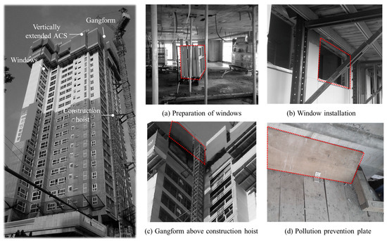 Figure 4 shows Building A, subject to the AWW method. The method was used for 20 units of the ACS where the walk plate was extended to the (N − 3)-th floor. The added work plate was made of aluminum bars, walk plates, and a handrail. Pollution prevention plates were installed on the (N − 1)-th and (N − 2)-th floors to prevent installed windows from being polluted by concrete paste (Figure 4d).