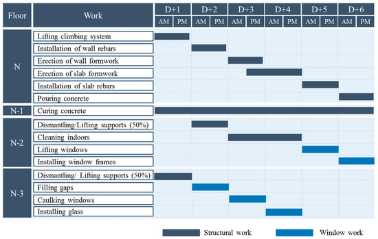 Figure 5 shows the process of the AWW method. Structural work for each floor was performed over six working days. Formwork, rebar work, and concrete placement were conducted on the N-th floor while curing took place on the (N − 1)-th floor. On the (N − 2)-th floor, 50% of the supports and forms were dismantled. On the (N − 3)-th floor, the remaining supports were dismantled and lifted to the N-th floor. Structural work was carried out in the same way as the conventional method, and only forms were removed on the (N − 2)-th floor in advance for window work.