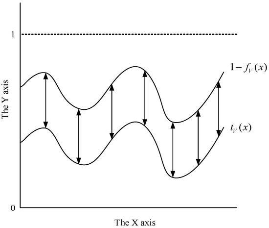 where, is called the true membership function of vague set , expressing the necessary degree of supporting evidence for ; is called the false membership function of vague set , expressing the necessary degree of opposing evidence for ; means the possible degree of supporting evidence for ; If is the vague degree of relative to the vague set , then, it means the degree of hesitation of relative to the vague set . It is a measure of the unknown information of relative to . The greater the value, the more unknown information relative to , as shown in Figure 1 [42].