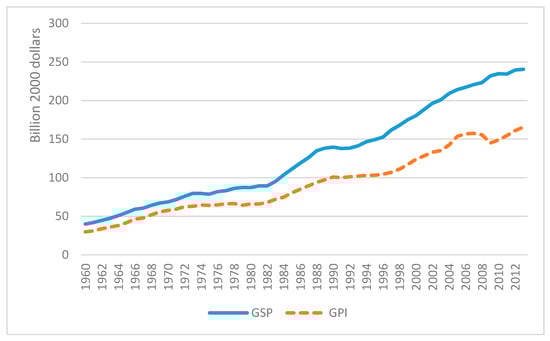 Maryland’s first GPI data, released in 2010, used the “GPI 1.0” methodology, incorporating 26 economic, social and environmental variables (see Appendix A). It showed that GPI, at roughly $150 billion, was only about two-thirds as high as the Gross State Product of $220 billion [,]. This GPI-GSP gap was relatively small from 1960 until the mid-1980s, before widening substantially (Figure 1), driven largely by growing income inequality [,]. The data did not, however, support the “threshold” hypothesis of ecological economists, who argue that GDP/GSP growth no longer improves quality of life once a certain threshold of material needs is crossed [], or the related idea that growth had become “uneconomic” in high-income nations [,,]. Although Maryland’s GPI grew more slowly than GSP and dropped even more sharply than GSP during the 2008–2009 recession, it showed no sign of plateauing [].