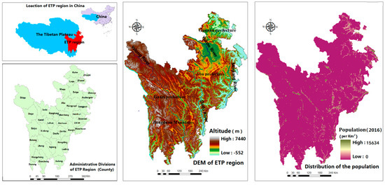 The Eastern Tibetan Plateau (27°59′27″~35°41′39″ N, 97°21′26″~104°42′07″ E)—the ETP region (Figure 1)—in this study consists of three prefectures (Aba and Ganzi prefectures in Sichuan Province and Gannan prefecture in Gansu Province). It covers a total area of 247,729 km2 and the total population is approximately 2.53 × 106 (http://www.sc.stats.gov.cn/, www.gstj.gov.cn/, 2016). The region features diverse terrain ranging from 2500~7500 m and it has a typical continental alpine climate, whose annual average temperature is 0~6 °C, while the average precipitation is 650 mm.