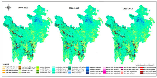 Spatial distribution of land use change during 1990–2015.