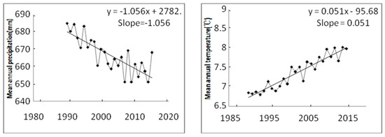 As shown in the Figure 3, the temporal and spatial variation of temperature in ETP region was obvious. In the past 25 years, the average annual temperature was 8.2 °C, the maximum temperature 15.5 °C and the lowest temperature −1.1 °C. During the past 25 years, the annual average temperature of the whole regions showed an upward trend and the inter-annual variation rate of temperature was 0.05.