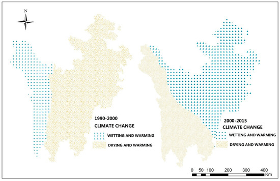 Viewed from spatial distribution, an obvious spatial heterogeneity was observed between 1990 to 2000 and 2000 to 2015 (Figure 4), especially in terms of precipitation, two different changing trends were observed. From 1990 to 2000, the wetting and warming area and drying and warming area accounts for 30% and 70% of the total, respectively, while from 2000 to 2015, the wetting and warming area increased by 30%. This may have an impact on the spatial distribution of ETP ES change, According to the study of Altay Prefecture [44], the climate change spatial heterogeneity was proved have a huge influence on Altay ES distribution, including soil conservation, water yield. Besides, it is noteworthy that in these two stages, land use change tendency is also apparent (Table 1).