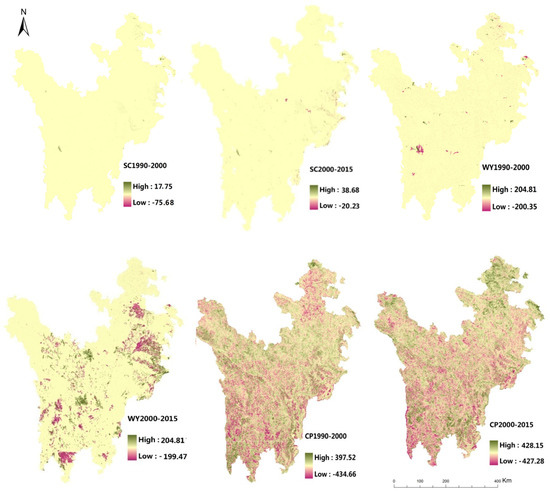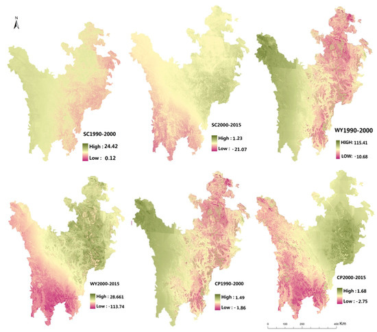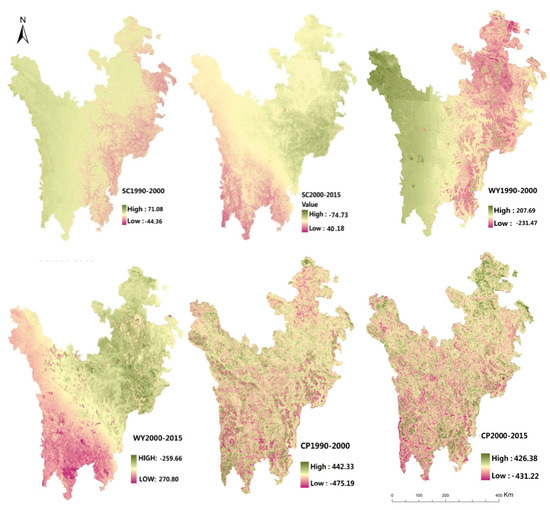Scenario I considered the impacts of climate change on ecosystem services only and ignored land use changes. In general, the selected ecosystem service showed a downward trend and was much lower than other two scenarios in quantity. Besides, the changing spatial distribution is similar with the climate change pattern in both three ES types studied (Table 2, Figure 5): (1) Soil Conservation: Soil conservation in the regional scale showed a decreasing trend, down by 0.38% per year. Soil conservation of forests, grasslands and bare land decreased by 4.3 × 106 t, 3.88 × 106 t, 0.52 × 106 t, respectively. While wetlands showed a rising trend, with 0.3 × 106 t increased. This tendency also can be observed from Figure 5, from 1990 to 2000, when the soil conservation of each ecosystem type except the wetland located in the eastern region decreased with the warming and drying climate change. The ES change tendency could also be observed in the next period. While as the main wetland distribution area, the soil conservation of Zoige plateau increased in both two periods in this scenario. (2) Water Yield: water yield in the ETP region dropped 8.59 × 109 m3 in the past 25 years, in which, the water yield of forest and grassland decreased by 3.08 × 109 m3, 5.24 × 109 m3, while the water yield of wetland had a slightly increasing, 0.34 × 109 m3 increased. In terms of spatial distributions, the ES changing pattern was similar to the climate change trend, especially precipitation change in the studied area, with the lower precipitation, the water yield of each ecosystem types reduced. While it is worth noting that the river valley located in the eastern region, mainly the Dadu River, has a stable water yield under the climate change background, this is largely due to the high altitude and it is a snow-fed river. Correspondingly, the much less negative impact of climate change can be observed on Dadu River than the Minjiang River in the eastern region, which is a precipitation recharge river. (3) Crop production: The crop production has few quantitative changes in the regional scale and the crop production of grassland, cultivated land, bare land showed a decreasing trend, with 0.67 × 106 t, 0.04 × 106 t, 0.14 × 106 t reduced for each type, while the forest had a different changing tendency, with 0.27 × 106 t increased. The spatial distribution pattern of crop production is similar to the soil conservation and water yield, varied with the climate change. In addition, the crop production of forest increased with the climate change in this scenario were observed, from 1990 to 2000, the eastern suffered from the warming and drying, the crop production of each ecosystem types decreased but the forest, mainly located in Jiuzhaigou County, Maoxian County, etc. while from 2000 to 2015, the forest in the western region, which suffered warming and drying climate change, increased in crop production—such as the forest in Shiqu County, Batang County.