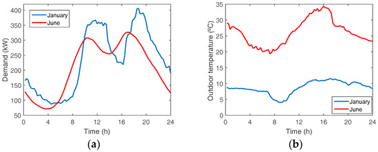A group of residential customers in Spain have been selected for simulation purposes. This group corresponds to real residential customers in Europe, with a rated power per customer ranging from 3 to 8 kW. Winter temperatures range from 0 to 15 °C and in summer from 20 to 40 °C. Figure 2a shows the winter and summer loads for two selected workdays monitored at the distribution transformer (CT) that supplies power at 400 V to the group of customers (basically residential and some small commercial supply). Figure 2b shows the outside temperature.