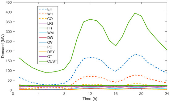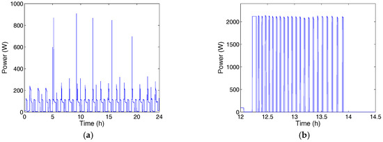To obtain some representative end-use profiles, it seems necessary to study load dynamics and the service the customer obtains from them. Figure 3a,b show some end-use load profiles for a household belonging to the aggregate residential demand, previously shown in Figure 2. It can be seen that the pattern for fridges is “constant” whereas WH demand is bounded to some hours throughout the day. This behaviour has been taken into account together with overall demand to define approximate end-use profiles (notice that it is important to give customers and aggregators a broad portfolio of options, ranging from simple DR&EE options to more complex options). In this case, feedback from everyday activities [34] of the customer is important to refine profiles, improve DR&EE success and gain customer interest in energy concerns. Figure 4 shows the proposed end-use profiles for an average customer.
