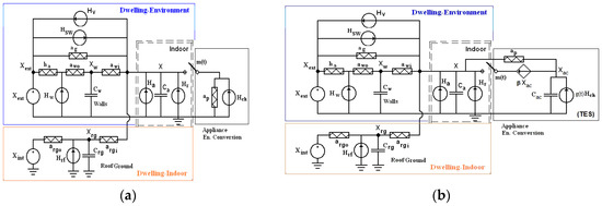 - Energy conversion submodel (the appliance): electrical energy conversion into heat (space heating), “cold” (air conditioning), or hot water. This is represented by a current source (Hch) and is independent of the dwelling submodels, see Figure 5a,b, where the same dwelling model can “host” different appliances with the same or similar service (heating/cooling).