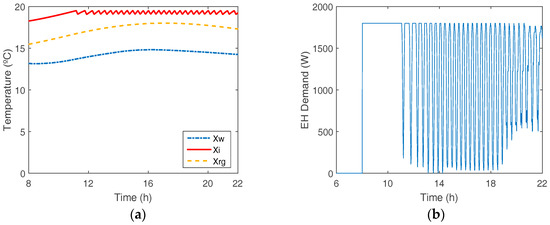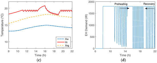 Example of two PBLM simulations for E matrix filling process. (a) State variables/temperatures without control (Xw: external walls; Xi: indoor; Xrg: roof/ground); (b) Demand of an average uncontrolled load [36]; (c) State variables/temperatures with preheating of the dwelling (14.30–16 h) and a control period (16–19 h); (d) Demand of an average controlled load being preheated (14.30–16 h) and controlled (16–19 h).