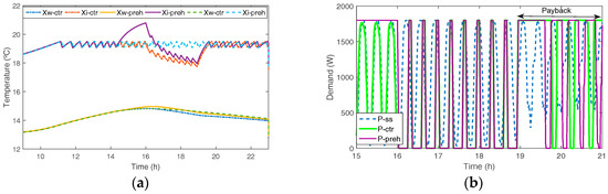 The second problem to be solved is to define E (elasticity matrix) and its coefficients. The evaluation of non-zero values outside the diagonal (i.e., substitution elasticity Eik) is based on PBLM simulations. To illustrate the procedure, an EH load (rated power 1800 W), working for conditioning (heating) a living room (30 m2) of a household is used for simulation purposes. For the sake of simplicity, Figure 6 only shows two out of twenty simulations: steady state in winter (aggregated daily profile already shown in Figure 2b and a preheating policy followed by a three-hour control period with 25% of a forced duty cycle (and the energy payback period due to this control). Other preheating times and forced duty cycles (from 10 to 50%) have been simulated, taking into account the values of Xi state variable (see Figure 6a,c) to maintain a minimum level of comfort in the dwelling being conditioned. The conclusion is that Eik values are only effective in the two immediate hours prior to PDR control period (from 16 to 19 h, see Figure 6) and in the two hours following the end of the control period. Otherwise, preheating does not have any positive result (more comfort during the control period, more flexibility in the control period, indirect energy storage in walls). The simulation also establishes and fixes LReu and LSeu values (eu = EH) in Equation (11) (Figure 6d).