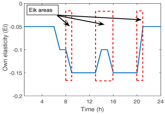 Table 5 summarizes the variables involved in Equations (3)–(9). Different variations on Equation (10) can be found in the literature [56,57] but they present some problems. For example: they do not consider some constraints in end-use flexibility due to electrical or service characteristics irrespective of energy price (it is not possible to switch-off or reduce demand for all the loads, for instance in the case of non-dimmable lights or washing machines, i.e., a change on switching times is possible but not a modulation of demand); load patterns or service requirements are not the same throughout the day (see Figure 3, or references [15,34]); some loads need a certain recovery period (to restore steady state service after control or to recover production schedule in the case of the industrial segment but this process is usually misunderstand and oversimplified [25,27]); the customer can apply some response previous to price peak periods but not during all the periods (for example precooling or preheating options are effective but only in periods near to peak-price response periods, i.e., Eik do not exists for none or many time periods); or the fact that changes in demand, due to substitution elasticity, involve an additional use of energy (i.e., thermal losses due to the switching of WH from service periods to 8–10 h before use). For these reasons, it seems more accurate (and complex) to apply a model for the evaluation of demand changes on each specific end-use (eu), linked with PBLM models that gives some feedback to model. The proposed model is driven by the expression: