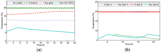 A simulation of the main TES State variables (see Figure 5b: (a) TES for full storage. Rated power 3.2 kW, storage capacity 25.6 kWh (b) TES for partial storage. Rated power 2 kW, storage capacity 16 kWh. The main characteristics of load can be found in [66]. Note that, for the sake of clarity, the graphic for Xac state (temperature of ceramic bricks, i.e., the heat reservoir) is made to a scale of 1:100.