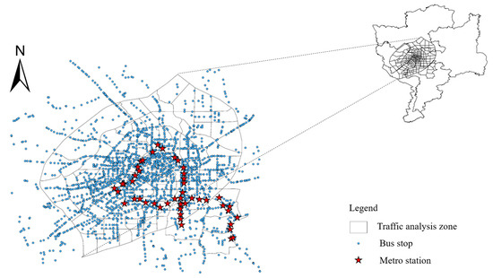 And the land use mixture is measured with the entropy method, which has been used frequently [46]. We use the points of interest (POI) data extracted from the Baidu Map to measure the land use mixture at the TAZ level rather than land use data due to the lack of data, which has proven to be effective for measuring land use mixture. The POI data extracted includes residences, hotels, restaurants, supermarkets, parks, squares, malls, schools, hospitals, banks and government departments. The land use mixture can be calibrated as follows: