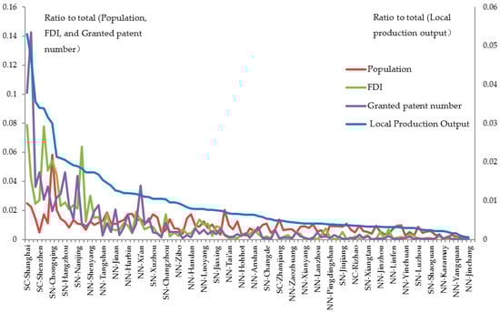 The following chart provides for a comparison of such diversities (Figure 1), where the first letter N denotes north China and S denotes south China; the 2nd letter C denotes coastal China and N denotes non-coastal China. The 106 important sample cities are ranked by production output, in contrast with other typical indicators. It can be seen from Figure 1 that even economic and openness measures diverse each other and innovation capacity as well as population measure vary in a great deal with economic output, especially for those samples within top 50 s. It is true that regions, especially cities, are actually differentiated in economic and other knowledge and innovation based factors. This may imply, on the one hand, that innovation movement is moving individually, when economic performance reaches to a certain standard. Besides, due to the nature of specific sectors (which vary in terms of demand in techno-scientific linkages and in closeness with other players for industrial development), large differences among cities or metropolises can exist depending on their industrial composition. Also, other multiple and diversified factors are noteworthy and ought to be studied in city-based regional innovation investigations, especially when sustainability issue is taken into account. What is more important is that this strongly signify the emergence of diversities which should be unavoidable in city based characters and worth to be further studied, especially in case of fast growing Chinese economies. The detailed information for Figure 1 including 106 cities is listed in Table A1 in the Appendix A.