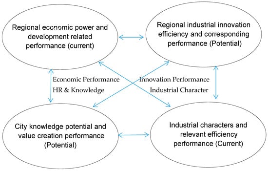 Investigation framework on metropolitan-based innovation movement. Regional economic and industrial performance (current linkage) vs. city HR & knowledge and industrial innovation performance (potential linkage).