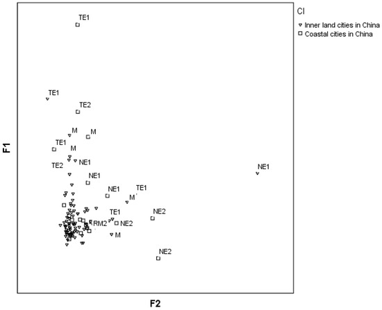 Special names in this table are used to classify different city groups. Sample cities in Group NE1 (New Economy Region 1) are significant in both economic performance and energy efficiency, which implies that those cities are running in a newly developed manner of economic progress, either high-tech based or service industry oriented. In any case, Newly Emerging can be named for those samples in the group. Similarly, sample cities in NE2 (New Economy Region 2) might be considered also significant in energy efficiency but with less economic power compared with samples in NE1. On the contrary, sample cities in TR1 (Traditional Economy Region 1) can be considered lower economic capacity but with much higher energy cost, which implies traditional industrial regions. Similarly, samples in TR2 (Traditional Economy Region 2) can be considered as more capable in production but require higher levels of energy use. It should be noted that samples in TE2 (Top Economy Regions 2) are both highly capable in economic production and significant openness and also have a higher level of energy cost, which indicates that those relevant sample cities may be in key positions in different manufacturing sectors, or Top Economies. Meanwhile, samples in TE1 (Top Economy Regions 1) can be economically capable of production value and less energy cost at the same time, which implies new type of production or a technology-intensive nature. Finally, remote regions can be defined here as sample cities that are in lower economic positions and have lower energy cost. Samples in RM2 (Remote Economic Regions 2) are classified due to their higher energy input but still lower production output.