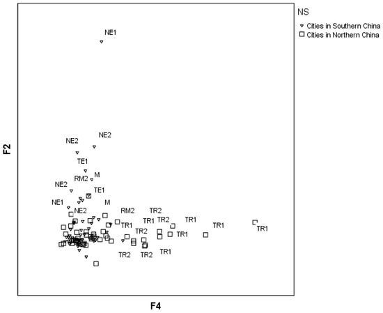 Regional current economic and innovation power (F1) vs. Regional economic power and Performance (F1) vs. Regional Industrial Innovation Performance (F2): Southern vs. Northern cities (NS contrast).