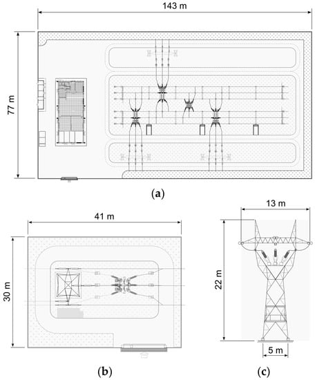 Two substations could be installed in correspondence of T1 and T4 structures, as shown in Figure 3b. However, this solution would again require creating two visually intrusive structures around the maneuver equipment, unsheltered from extreme weather conditions and possibly subject to snow cover, using a large amount of land (≈2500 m2 in total) and requiring an equally long authorization process.