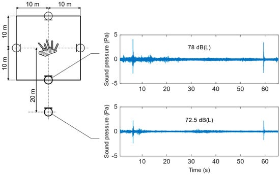A sound source emitting transient noise is characterized through its energy level determined by sound pressure level measurements according to ISO 3746:2010 standard []. The TSGs are placed open-air, essentially in free-field conditions, and over a hard surface. An Oros OR36 multichannel analyzer and two Brüel & Kjær Type 4189 microphones have been used. The control surface prescribed by the standard should be a hemisphere or a parallelepiped. The latter configuration has been chosen, with face-center microphones placed 10 m away from the device: however, it is worth noting that it has not been possible to make measurements above a height of 3 m for safety reasons, thus the upper face of the control surface could not be completed. A sketch of the measurement positions is shown in Figure 5: sound pressure level measurements along the main axes of the TSG showed that the source can be considered omnidirectional and that the decay with distance is typical of a point source (that is, the sound pressure level decreases by 6 dB per doubling of distance).