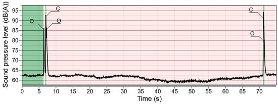 The test sequence adopted for the measurements is characterized by two events. The duration of each noise event is about 1 s and the shortest interval between two consecutive operations is 60 s. Several measurements have been repeated on the same test sequence, providing similar values of the measured quantities for the different positions and for the two events. Figure 6 shows an example of A-weighted sound pressure level measured during the execution of the test sequence using the “Fast” detector. It can be seen that each event is made of a rapid series of more peaks: in particular, the first event consists of an open–close–open (O–C–O) sequence, produced by the automatic attempt of the TSG to re-connect the line. After about one minute, the TSG makes a second attempt, which, if unsuccessful, results in a new close–open (C–O) sequence.