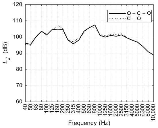 where fc is the center frequency of the considered one-third octave band, Lp is the space average of the statistically averaged single-event time-integrated sound pressure levels, k1 is the correction accounting for the background noise, k2 is the correction due to the reflections, and S is the area of the control surface enveloping the source. The difference between the total noise including the TSG impulse and the sole background noise inside the station exceeds 10 dB in the whole frequency range of interest, so the correction k1 in Equation (1) can be neglected. Similarly, when the measurements are carried out in open-air, the correction factor k2 can be ignored. The spectra obtained for the two events are shown in Figure 7. The computed overall sound energy level of the TSG is 115.5 dB (O–C–O event) and 115.8 dB (C–O event).