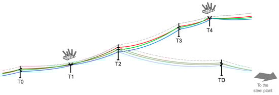 Example of variability in the relative position of the conductors along the transmission line. The installation of two TSGs is planned on trellises T1 and T4.
