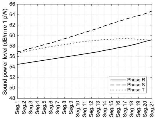 Sound power level due to corona discharge from each of the segments in which the line between trellises T1 and T2 has been divided for the simulations (spatial discretization: 10 m).