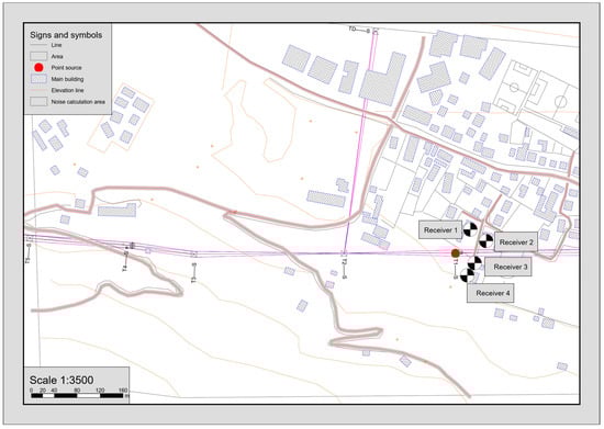 To run a complete noise propagation simulation, two point sources representing the TSGs and three line sources representing the conductors have all been introduced into the model. The software used is SoundPLAN® 8.0, a ray-tracing program implementing the procedures included in the reference international regulations. The choice of a professional software has been made for its advanced computation and three-dimensional representation capabilities, which are essential characteristics in this type of impact assessment evaluations [,]. The relevant standards in this case are the ISO 9613 part 1 and 2 [,] for outdoor sound propagation from industrial sources, and the CNOSSOS-EU protocol []. The simulation area is a rectangle with dimensions 1.1 km × 0.6 km including the transmission line, limited to such extents because, at distances above 250 m from the sources, results may be not reliable due to temperature gradients and wind. Seven sectors of the power transmission lines, positioned between eight trellises, have been introduced in the complete model. The local terrain is characterized by mountains, so particular attention has been paid to preparing the digital ground model. In the simulation, the trellis structure itself is not an acoustic source, but the TSG mounted on it is the main source type to be investigated. The TSGs have been modeled as point sources according to the description given in Section 2.2 and placed at the design elevations. As concerns the transmission line, the position of the conductors has been introduced in the model considering the catenary equation computed from the design parameters: mass per unit length, tension and average temperature of the conductors. Once terrain and sources have been fully characterized in the model, buildings and roads have been added, as well as some visual elements included as references. In terms of noise propagation, the only element of interest is represented by the buildings, since they act as a sound barrier. For this reason, they have been introduced with their real height. The main goal of the simulation campaign is to predict the sound pressure level distribution 4 m above the ground and at some specific positions where the noise impact can be particularly noticeable for the population (receivers placed closest to the line). For this reason, the four closest receivers have been selected as probes to evaluate simulation results. The receivers’ locations are defined in Figure 10.