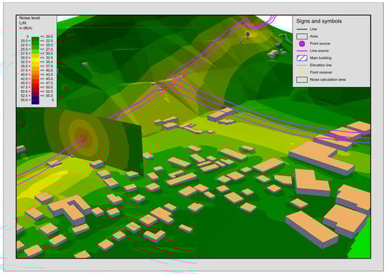 - International Organization for Standardization. ISO 9613-2:1996—Acoustics—Attenuation of Sound during Propagation Outdoors—Part 2: General Method of Calculation; International Organization for Standardization: Geneva, Switzerland, 1996. [Google Scholar]