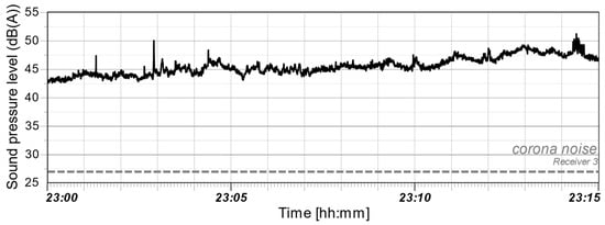 To experimentally estimate the corona effect contribution, one can extract the portion of the time history with a low sound pressure level and analyze the corresponding average spectrum. Below the hearing threshold, the measured sound pressure levels are 57, 57, 54 and 48 dB in the one-third octave bands from 10 to 20 Hz, which are low values if compared to DEFRA guideline recommendations []. This result agrees with other available literature findings []. Therefore, only the audible frequency range will be considered in the following. As previously described, the corona noise emission usually displays a humming component at 100 Hz and a broadband noise above 1 kHz. From the extracted spectrum shown in Figure 13, the latter component cannot be seen, while a continuous spectrum in the mid-frequency range is observed, which can be attributed to industrial noise such as the steel factory emission. On the other hand, the peak at 100 Hz can be clearly spotted: if its sound pressure level, 45 dB, is A-weighted, one obtains 45 − 19.1 ≈ 26 dB(A), a value close to the LE,corona = 27 dB(A) predicted by the simulation. Finally, this value can be energetically subtracted from the residual LAeq = 45.9 dB(A) to isolate the background noise contribution: the resulting value of 45.85 dB(A) shows that the corona discharge noise has a negligible influence with respect to environmental noise coming from other sources.