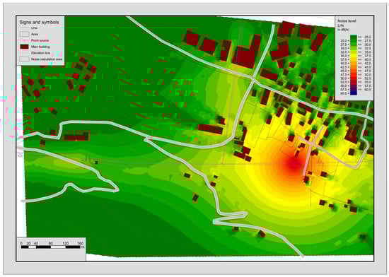 Noise mapping of the overall infrastructure emission: equivalent sound pressure level, with three impulsive events in 15 min.