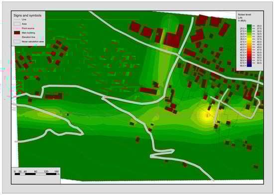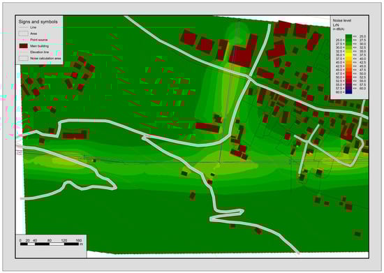 In the context of an assessment performed in compliance to the Italian legislation, the absolute immission and emission limits must be evaluated by distributing the noise induced by corona discharge and TSG operation along the whole night-time: therefore, the A-weighted sound pressure level is obtained by considering stationary corona noise and three TSG actions during the night and computing the equivalent level over the entire reference period. The resulting map is reported in Figure 15.