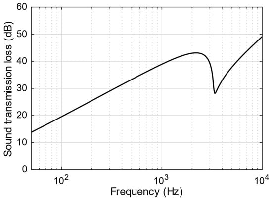 If no solid connection is realized between the vibrating surfaces and the sound insulating panels, and the shell is tailored to the circuit breaker box size, the resulting sound energy level radiated by the point source representing the TSG can be estimated by subtracting the sound transmission loss of the insulating panel from the measured sound energy level of the source. Figure 18 shows the sound transmission loss of a composite panel made of two external aluminum 4-mm sheets sandwiching a 10-mm polystyrene core (overall mass per unit area 22 kg m−2), determined according to the method outlined in []. Based on this model, the designed insulating shield should allow to achieve an average single-valued sound reduction index of 37 dB.