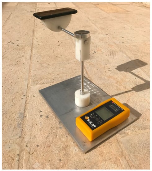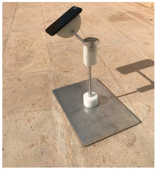 A mechanical setup, shown in Figure 2, is proposed to help with the required measurements. It consists of a freely-rotating platform where the smartphone will be attached. The whole platform and the cross bar can be rotated horizontally. There is also a compass attached at the top for reference. This setup has been made in the workshop and has already been used in our previous work [], which contains more details about the setup. When the platform rotates vertically, it changes the tilt angle and the incident angle. The objective of this experiment is to validate our use for smartphones as a tool for solar irradiance measurement.