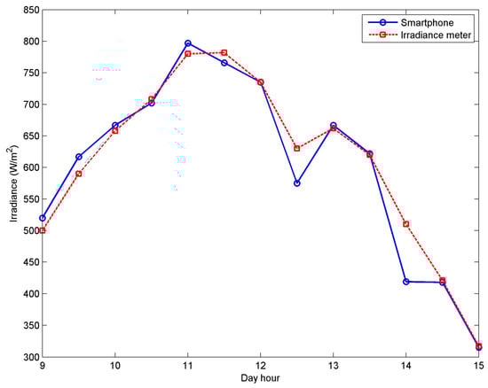 Solar irradiance in W/m2 versus day hour at zero tilt angle for smartphone and irradiance meter measurements.